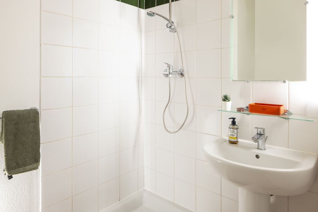 - The shower room: washbasin, shower and toilet.